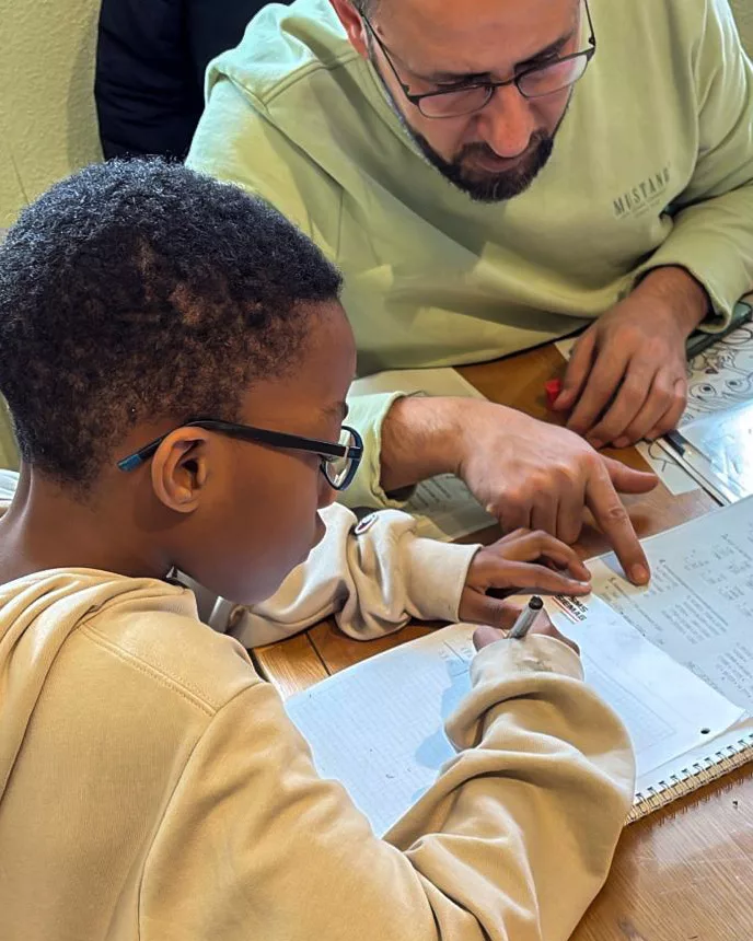 Nach dem Essen setzen die älteren Kinder ihre Aufgaben fort. Wir nutzen verschiedene Räume, um ruhige Arbeitsatmosphären zu gewährleisten und Ablenkungen zu vermeiden. Die Betreuung ist intensiv und eng begleitet: Lernmaterialien werden kontrolliert, Fortschritte dokumentiert und Arbeitsproben der Kinder in individuellen Mappen gesammelt. Dadurch können wir Entwicklungen sichtbar machen und gezielt fördern.